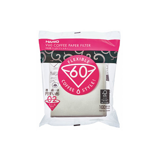 A pack of paper filters for the V60 series. These filters are compatible with either the 01 type (1-2 cups) or the 02 type (1-4 cups). Made with 100% oxygen bleached paper pulp.